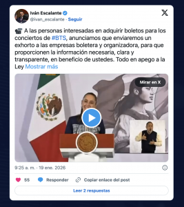 Iván Escalante Ruiz, titular de la Profeco, indicó que se emitirá un exhorto formal para que Ticketmaster transparente fechas, precios y costos finales de los boletos. También confirmó que habrá dos preventas antes de la venta general y aseguró que, ante cualquier manifestación o inconformidad, las demandas de los consumidores serán atendidas.