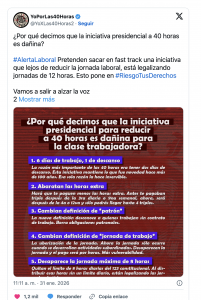 Fue el Frente Nacional por las 40 Horas y Movimiento Ciudadano (MC) quienes se pronunciaron en contra de esta iniciativa debido a que empeora el esquema actual de precarización laboral.